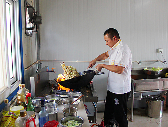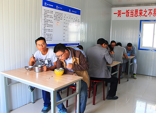 自工程开工以来,项目部在“三工”建设上统筹规划,共留出5间房专门用于食堂操作、仓储及就餐,可满足50人同时就餐,有效确保了后期大干期间的就餐空间需要。此外,项目部还为餐厅配置了消毒柜(分玻璃容器和碗筷两类)、冰柜(分肉类冷冻、果蔬冷藏两类)、蒸饭柜、燃气灶、操作台等设备、器具,餐厅配置了崭新的桌椅。具体而言:一是通过设立专人管理食堂,并对周边大型菜市场进行实地调研,最终选取一家品种丰富、有质量信誉保证的批发市场作为主要供应商;二是聘请有经验的专业厨师掌勺,并实行持健康证上岗制;三是突破一日三餐及采购限制,根据需要提供夜宵并自制馒头、包子、饺子等面食;四是每天安排专人消毒餐具、清理桌面、冲洗地面,并定期、不定期对食堂卫生状况进行监督检查,做到地面无积水、窗台无尘土、卫生无死角,让职工吃得安心、吃得放心。同时通过制定食堂采购及核算管理办法,编制食堂日常菜谱,进一步确保了饭菜质量,满足了员工饮食需求。