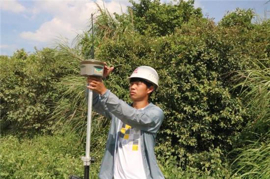 施工队长柳雁兵穿着防晒服,在福社隧道洞口前喷绘明洞仰拱开挖边线,他说:“以前没有穿过防晒服,要谢谢项目部发的这件‘宝贝’。”