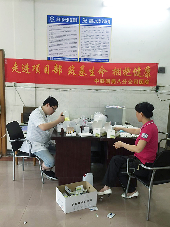 6月15至16日,八分公司医疗小分队第一站来到深茂项目部,他们一到现场,顾不上休息,就在作业队支摊设点,边为员工按规体检边解答困扰员工的问题,通过体检让员工清楚了解自己身体健康状况,通过宣传疾病防疫知识,让员工清楚了科学健身的重要性,受到了员工们的称赞,增强了员工“幸福企业”的认同感和归属感。